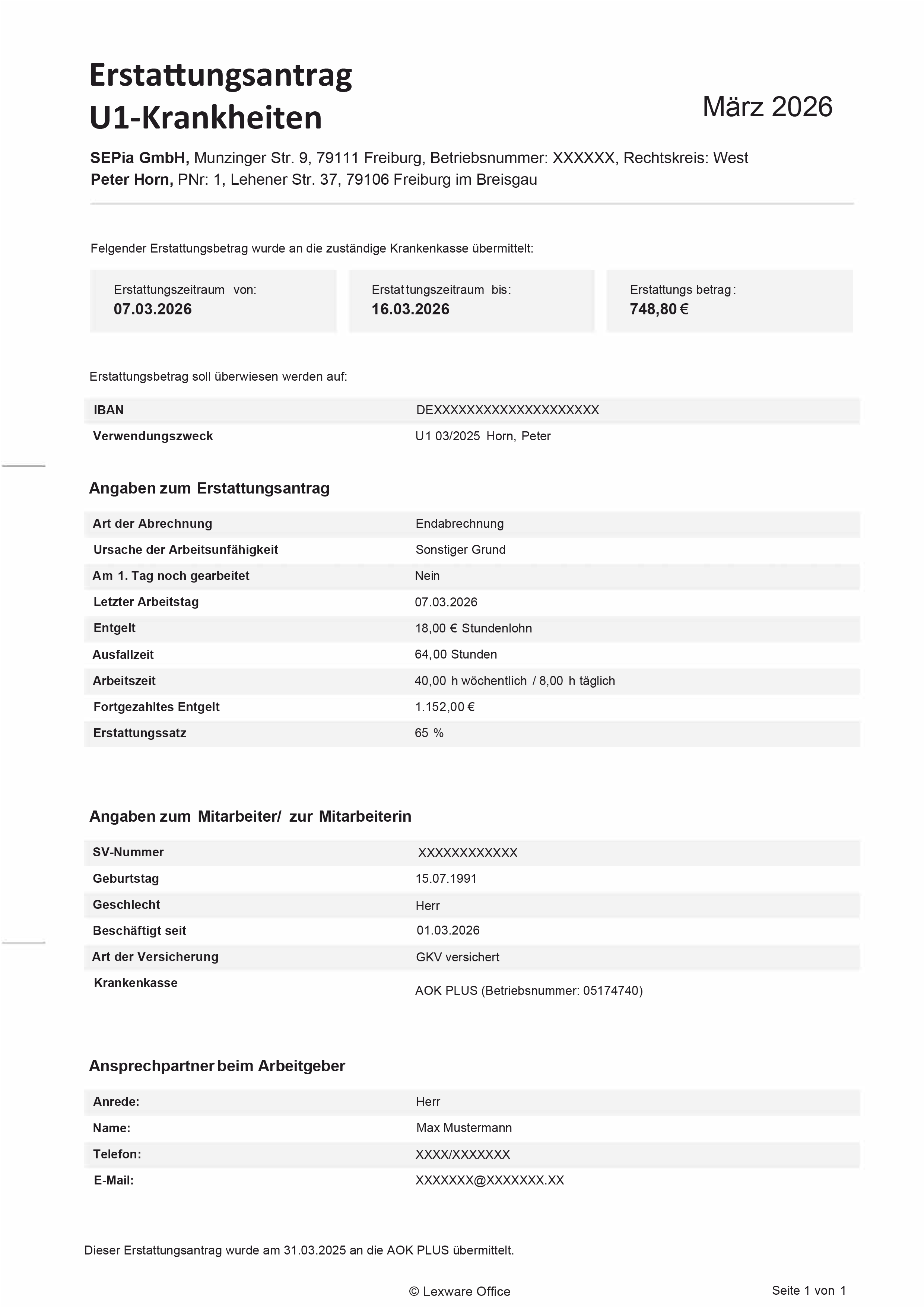 Weiterhin stelle ich Stunden, Krankheit und Urlaub meiner Mitarbeiter zusammen. Anstatt die Daten dem Steuerberater zu senden, gebe ich sie in Lexware Office ein. Fertig!!! Finanzamt, Krankenkassen, Mitarbeiter: Nie kam eine Beschwerde. Wirklich klasse!